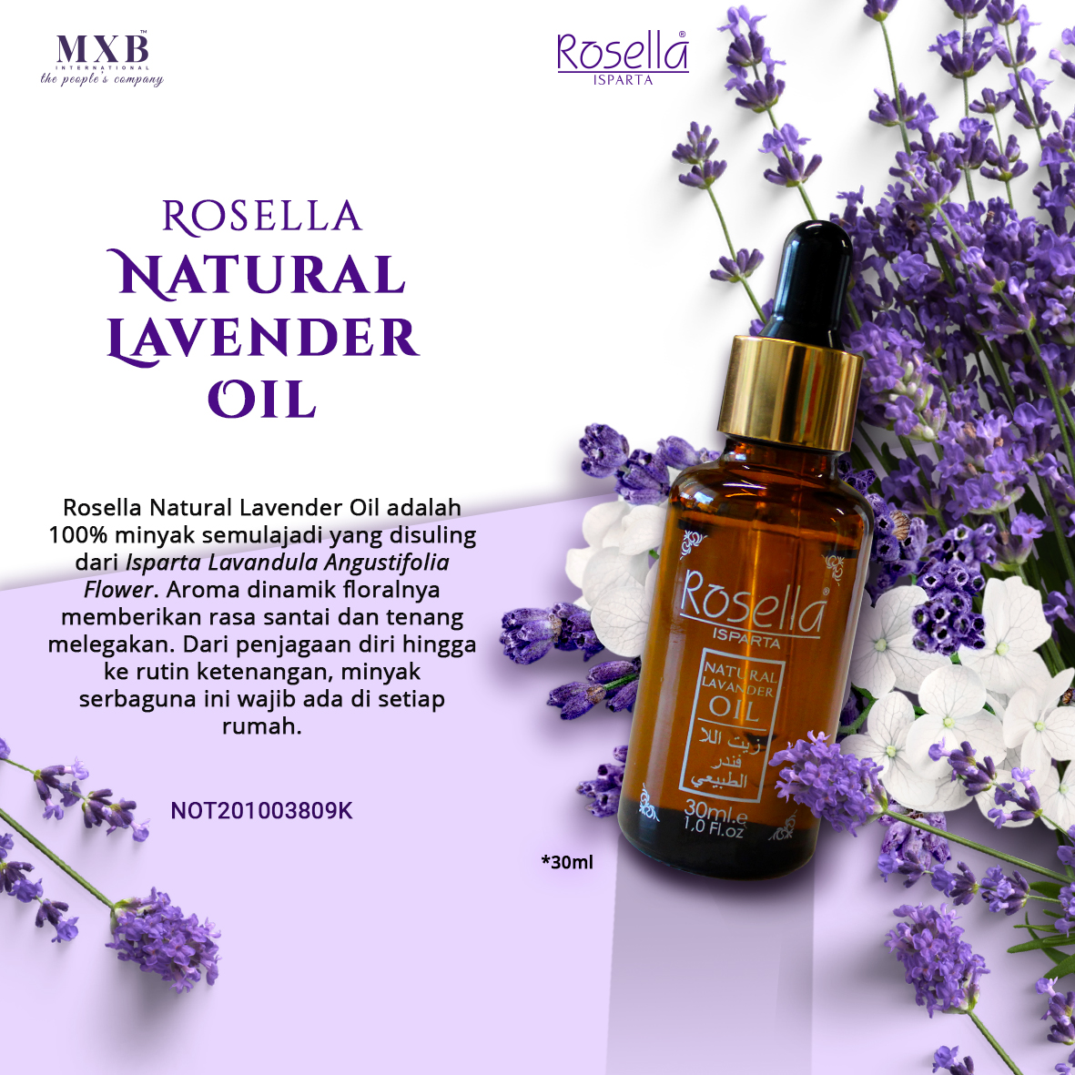 Minyak Pati Semula Jadi Rosella – Lavender, dihasilkan menggunakan bunga lavender unik yang ditanam dengan kepekaan dan minat yang tinggi terhadap tanah subur Isparta, membantu menghilangkan rekahan yang disebabkan oleh kekeringan pada bibir anda. Di samping itu, anda boleh menjalani hari yang lebih luas dan selesa dengan beberapa titis minyak lavender pada leher, belakang telinga dan pergelangan tangan anda. Minyak Lavender Asli Rosella juga menyumbang kepada pengukuhan rambut anda dan pengurangan keguguran rambut anda jika anda mengurut kulit kepala anda dengan hujung jari anda. Sesuai untuk jenis kulit normal.